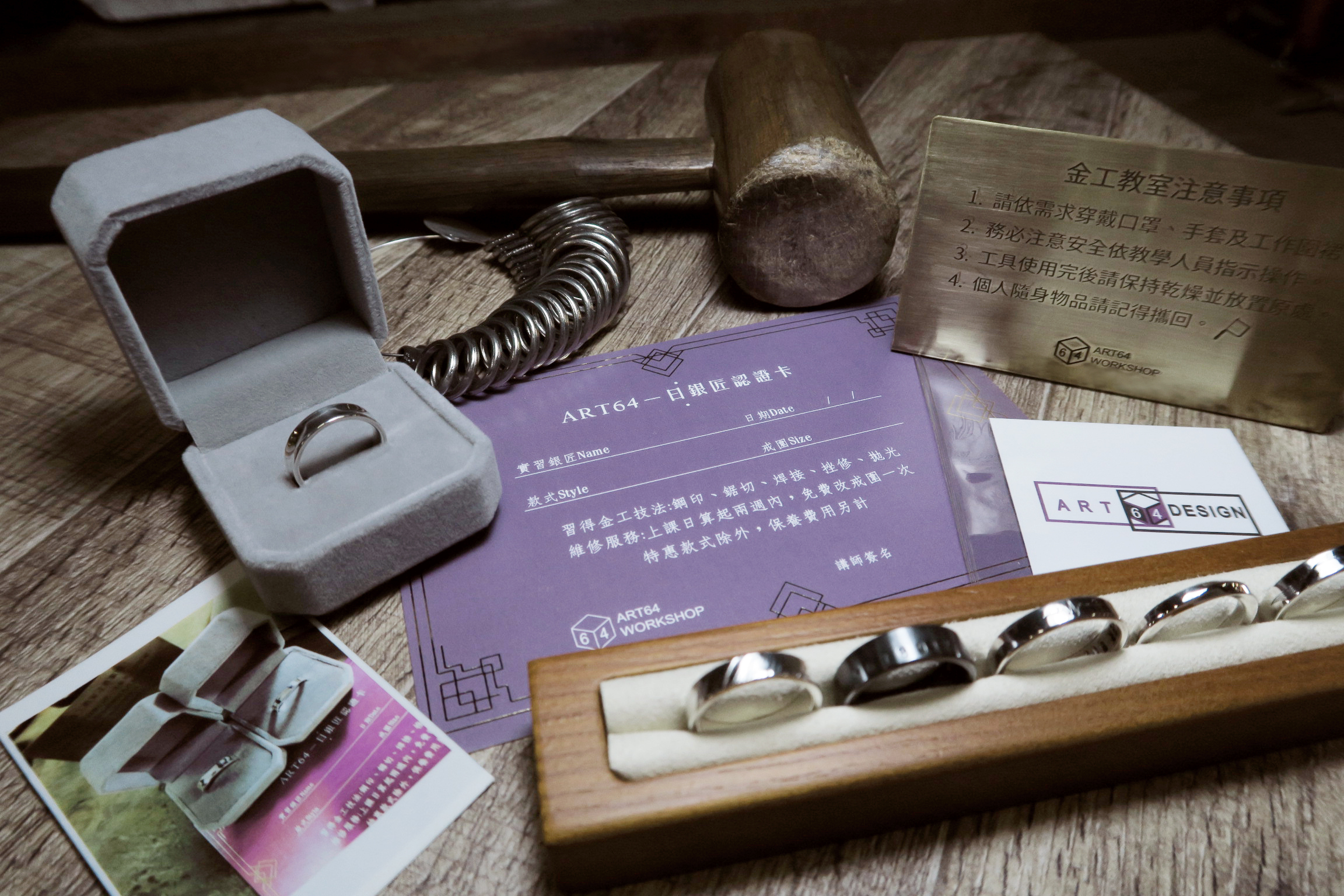 印上意義非凡的文字,讓珍貴的記憶永存於心課程重點在戒指表面敲印紀念文字學習鋸切金屬、焊接純銀、手工研磨與拋光技法作品內容:1只純銀戒指成品寬度:約5mm質感選擇:亮面、霧面或鍛敲質感課程時間:約2小時課程專屬紀念紀念拍立得1張銀飾保養須知與英國製拭銀布1組ART64品牌包裝與一日銀匠認證卡