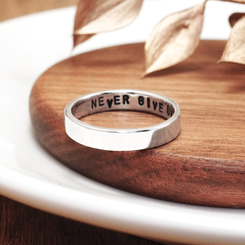 日常系簡約銀戒,造型大方好搭配,印上意義非凡的文字,讓珍貴的記憶永存於心