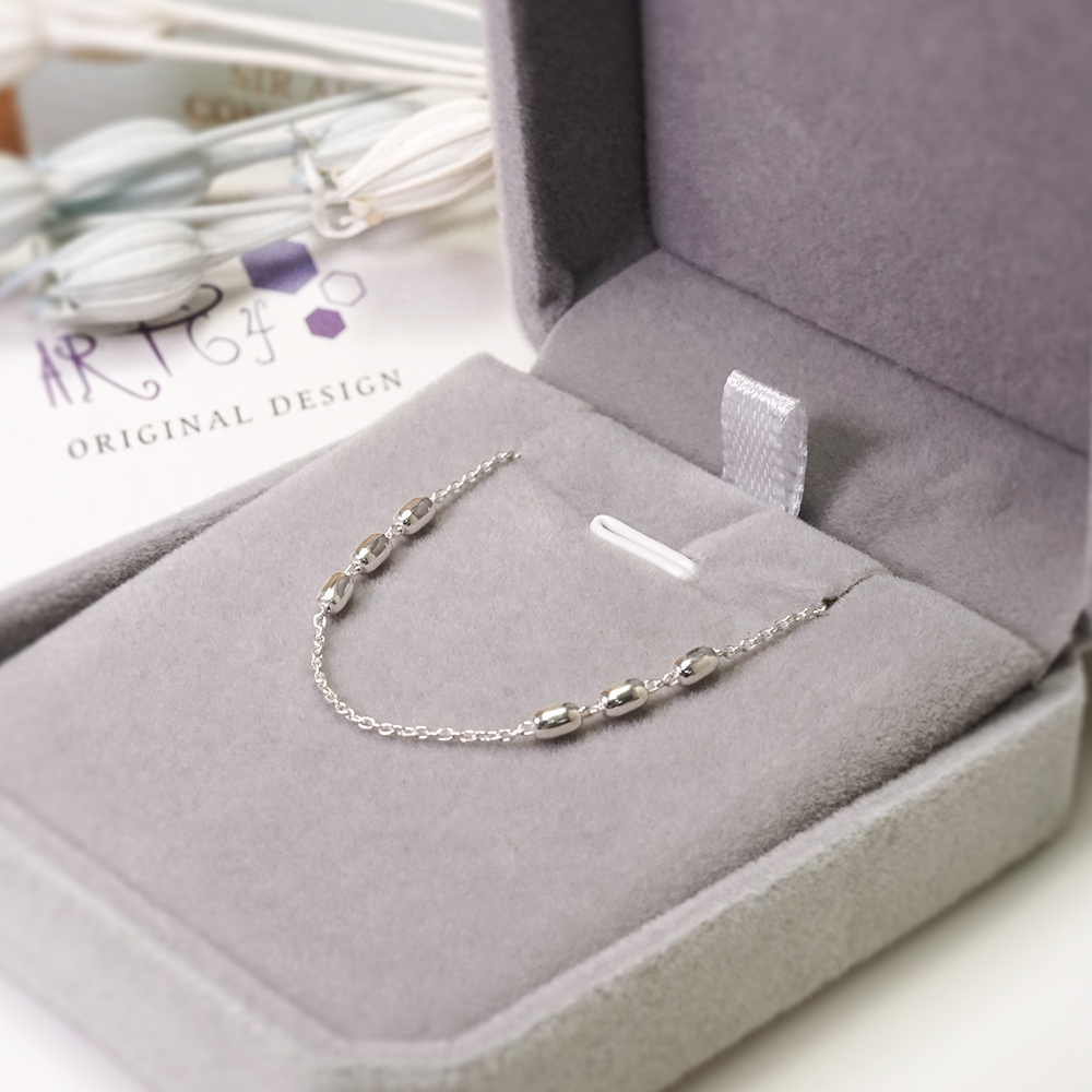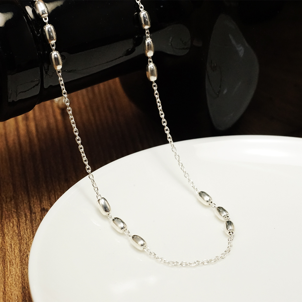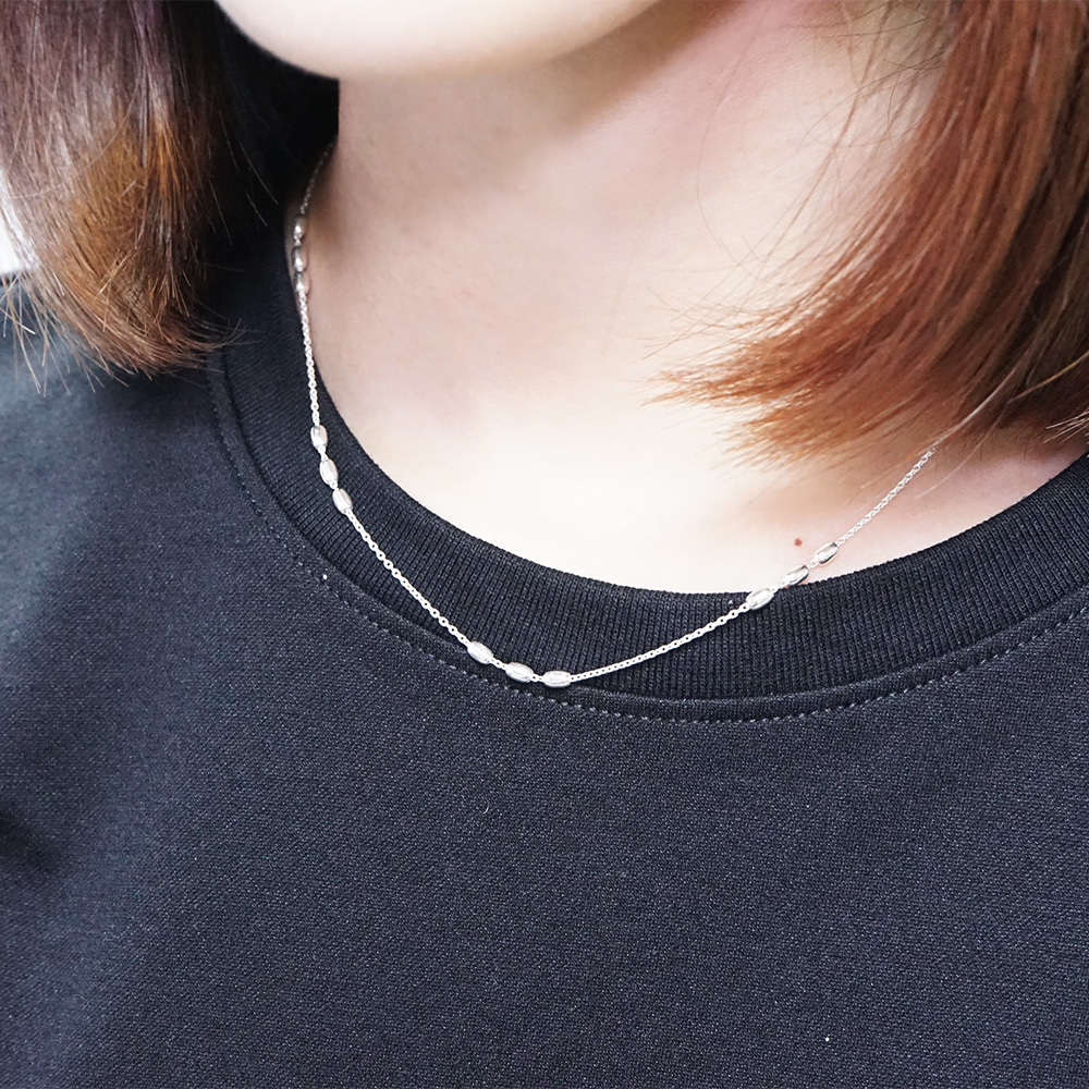 造型別緻的橢圓銀珠融合經典銀鍊,成串而不連續的設計,在間隔之中創造停頓,讓純銀柔美的光芒綻放其間。