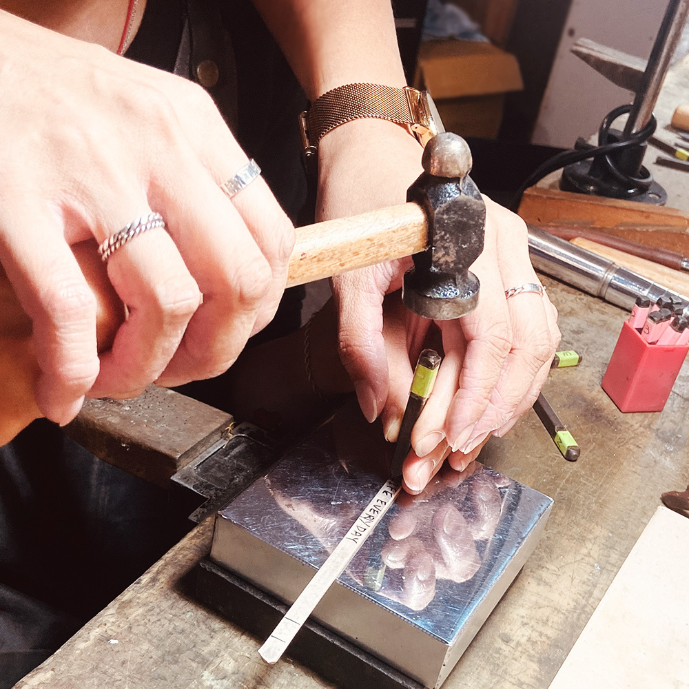 課程重點在手環表面敲印紀念文字學習鋸切金屬、手工研磨與拋光技法作品內容:1只純銀手環成品寬度:約6mm質感選擇:亮面、霧面或鍛敲質感課程時間:約3小時課程專屬紀念紀念拍立得1張銀飾保養須知與英國製拭銀布1組ART64品牌包裝與一日銀匠認證卡