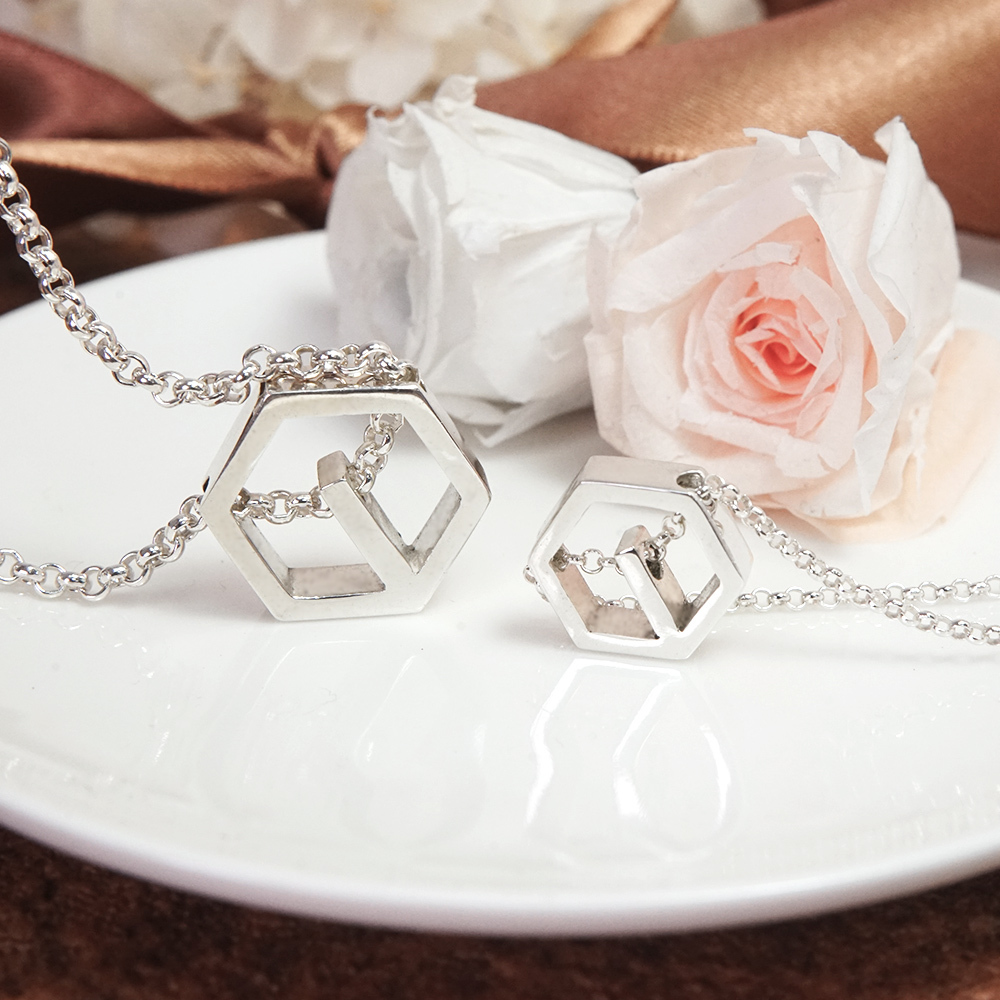 穩固的正六邊形,是ART64的品牌識別。運用巧思融合品牌形象,將六邊形結構與銀鍊相互結合,交織成與眾不同的獨特樣貌。情侶款採用一大一小的設計,象徵以穩固的正六邊形,成為彼此最信賴的依靠
