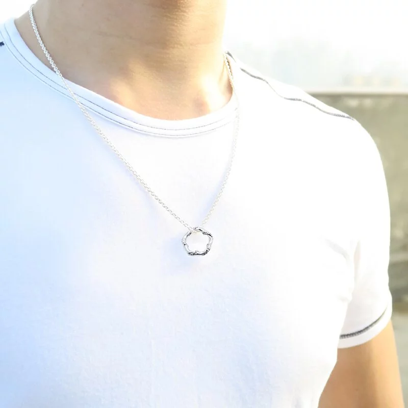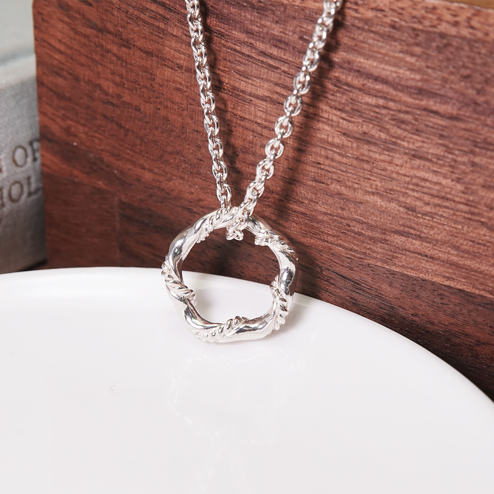以緞帶與麻花編織成圈,象徵完整與圓滿。相互纏繞的設計使銀墜層次分明,在領口間綻放耀眼光澤