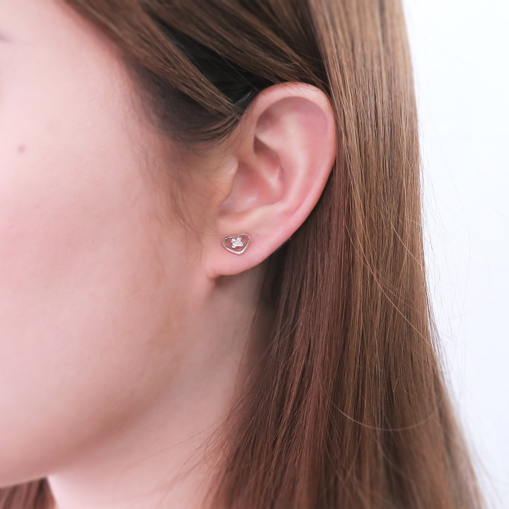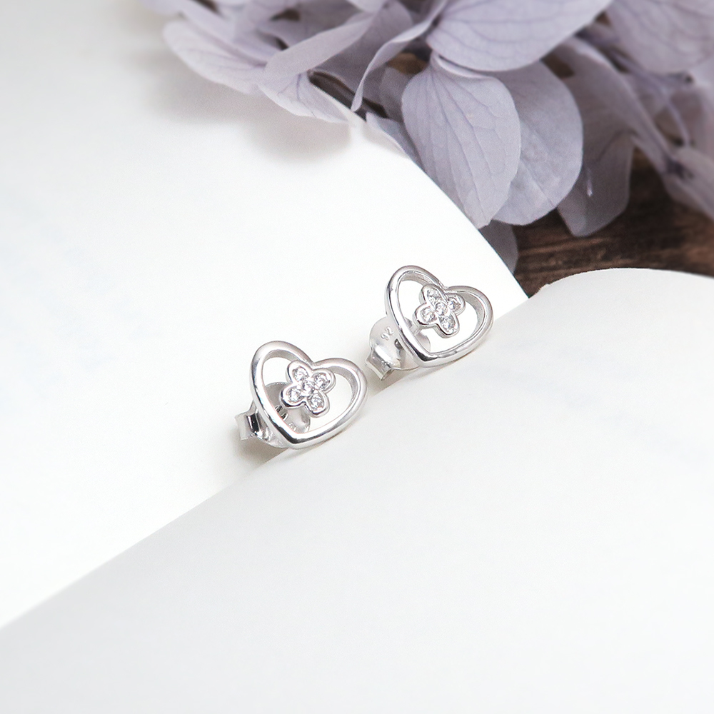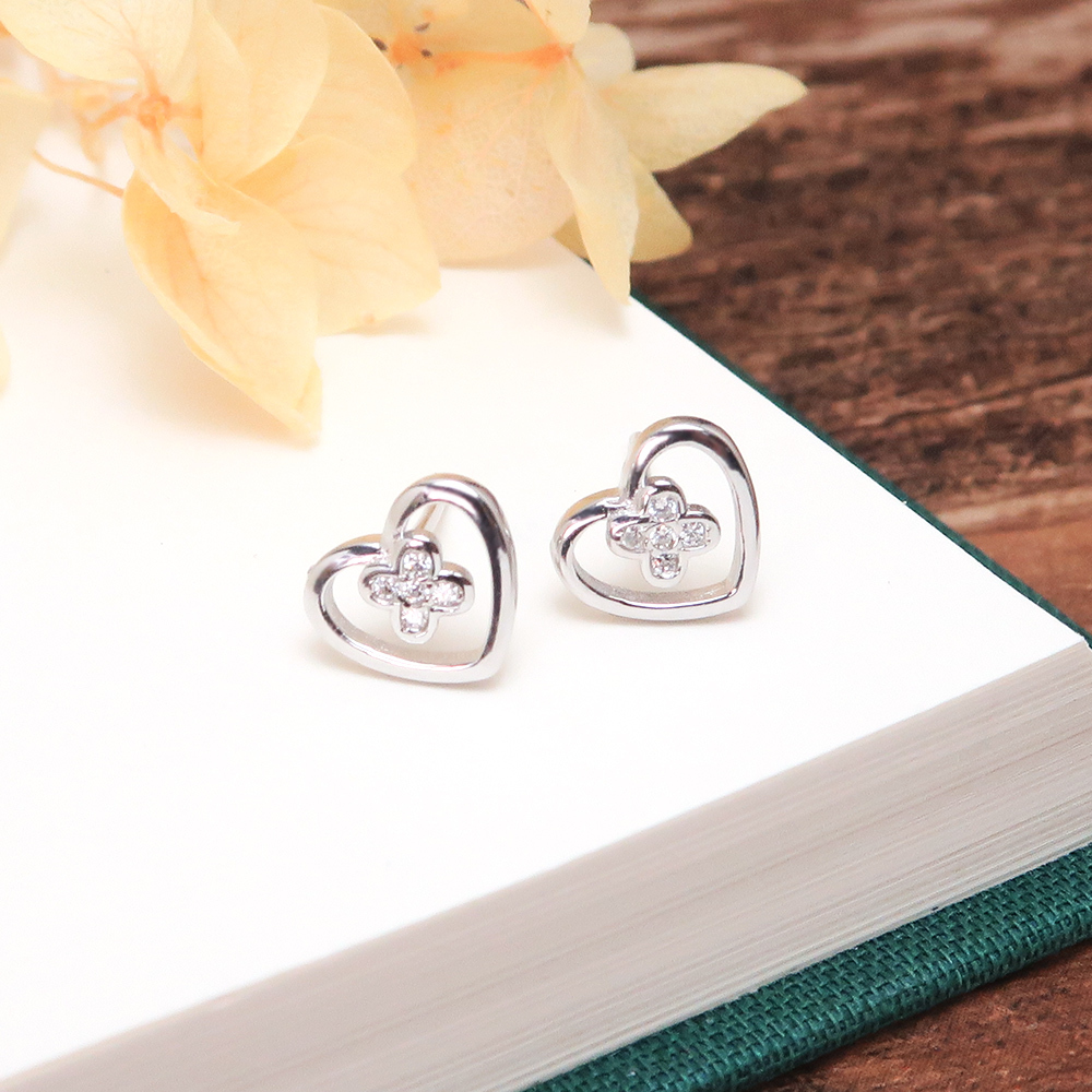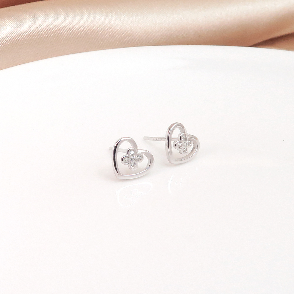 幸運草之心耳環以925純銀製作,並以珠寶電鍍工法鍍上白K金,鑲上光芒耀眼的方晶鋯石
