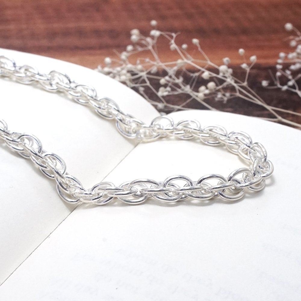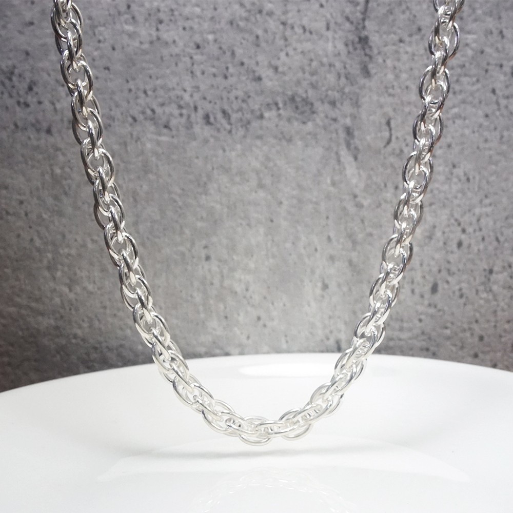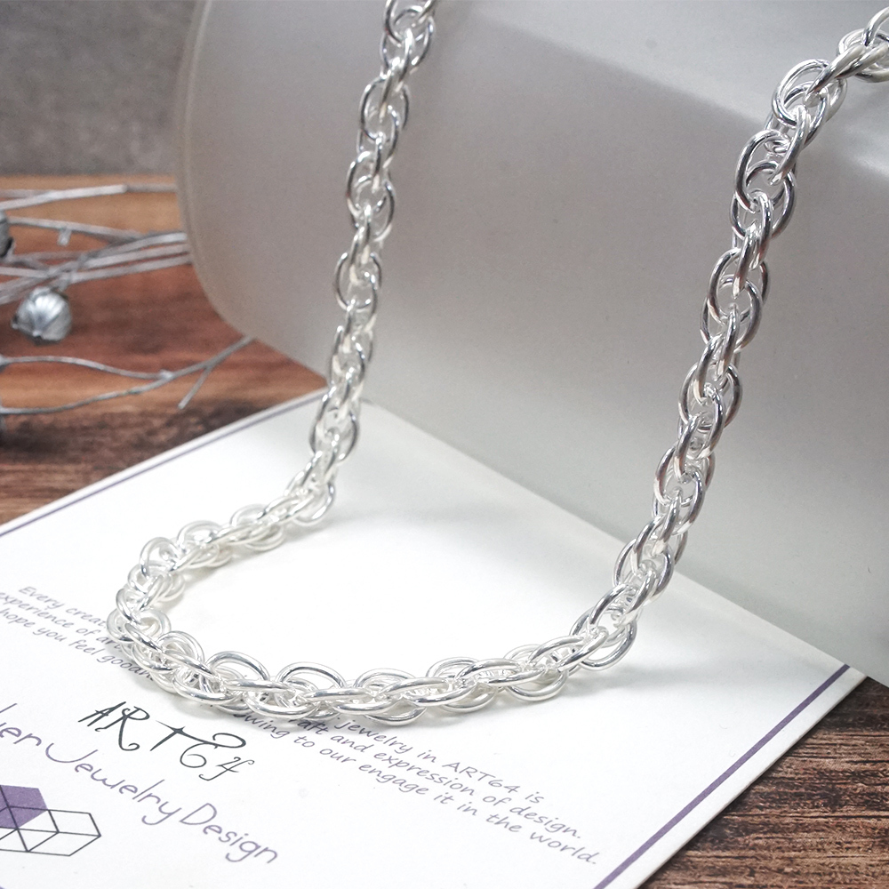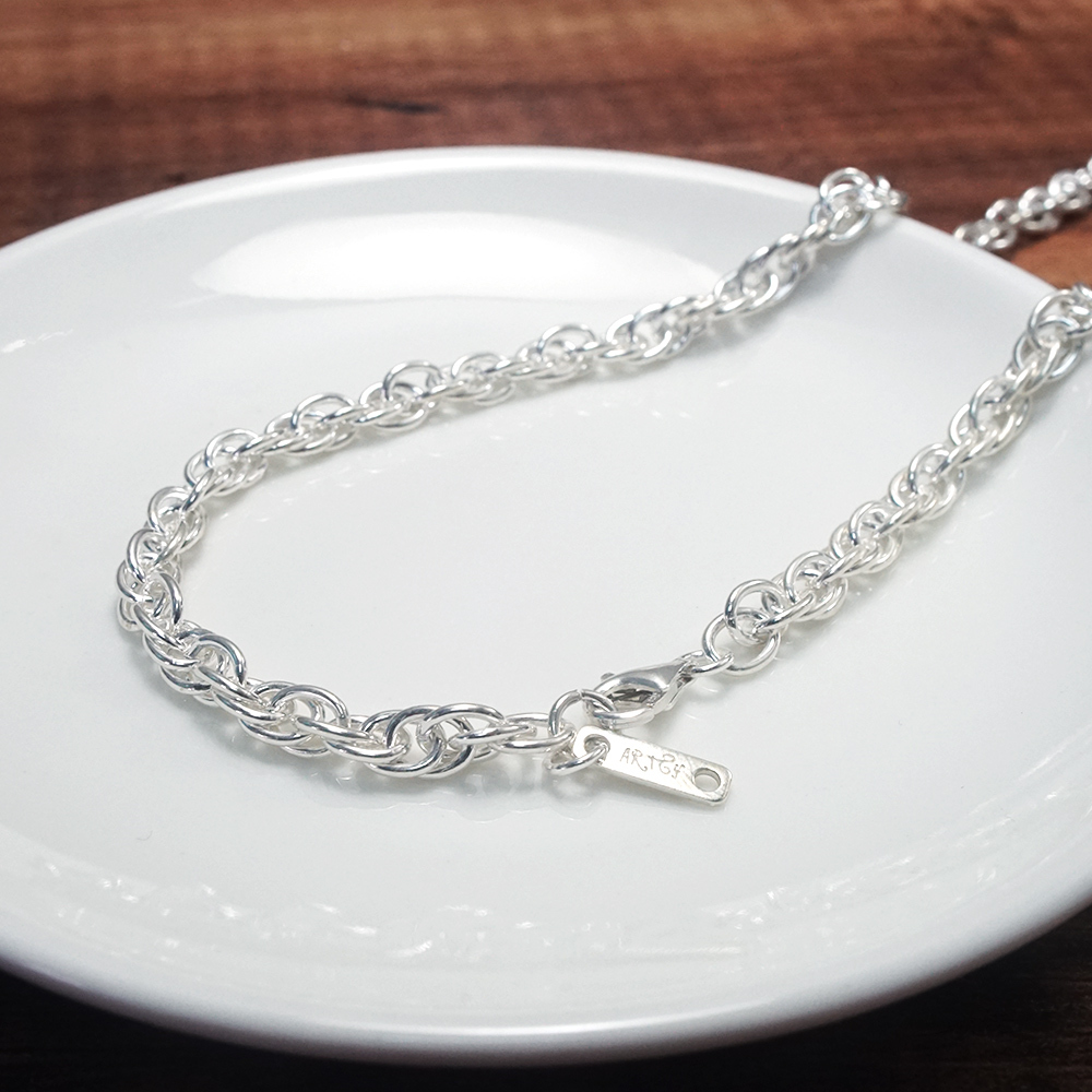 由雙層銀圈編織而成的雙扣圓圈鍊擁有螺旋狀的外型,特殊的編織結構使光線能在鍊圈之間自由穿透,色澤多變的光影也使項鍊彷彿在領口間緩緩旋轉,創造充滿律動感的獨特風格。